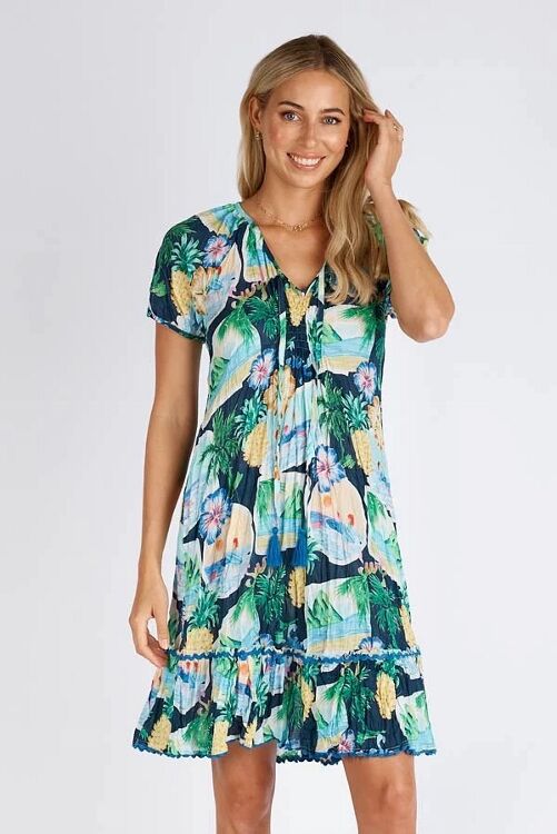 Shirring gives this dress a lovely shape on the body. V neckline with tassle ties, short sleeves and a pretty summer print. 100% cotton