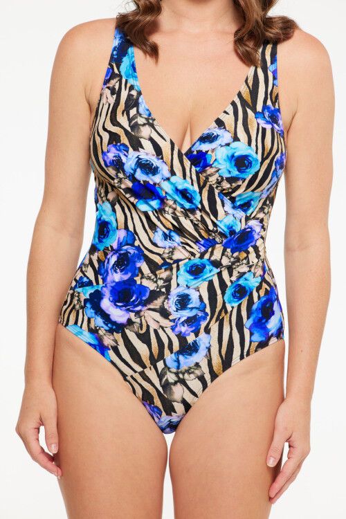 A popular style of TOGS, the Surplice one piece swimsuit in the exclusive Roma print with a flattering 3-way ruching design. Featuring power mesh tummy control, V neckline, 3-way ruching and elastic under bust support. Nylon/elastane