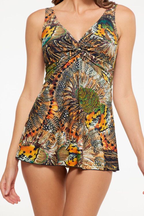 Offering coverage and confidence, the Swimdress Twist is a one piece swimsuit that provides a longer length and support in the right areas. Featuring a great A-line design, elastic under bust support, power mesh tummy control, adjustable straps and full lining. 82% Nylon, 18% Spandex