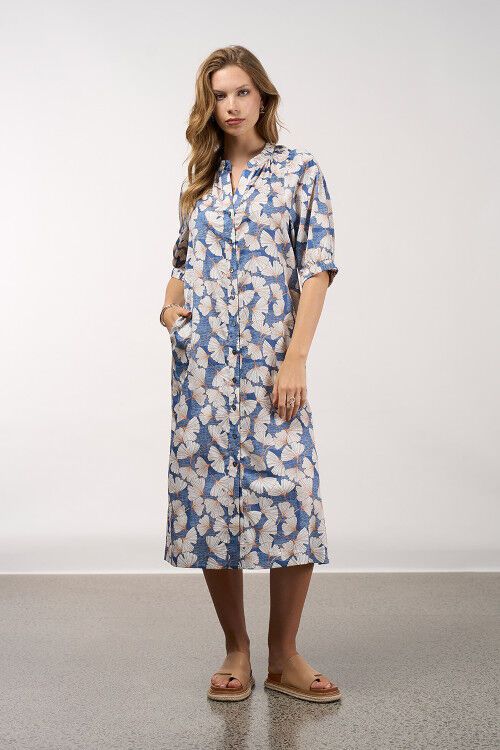 A printed, button-through dress featuring stitched down in-seam pockets, a soft gathered neckband, blouson sleeves with elasticated cuffs and deep splits at the hem. 100% cotton