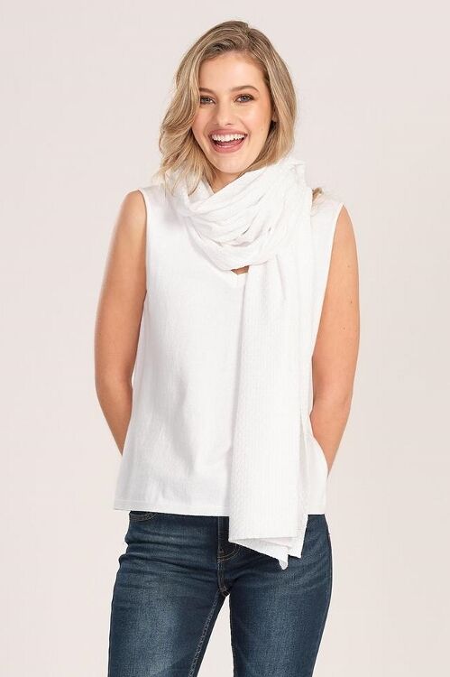 A handy wrap to go over a summer dress. The photo shows it being worn as a scarf but it does drape beautifully as a shoulder wrap too. Lightweight with a subtle texture. Made in New Zealand. Cotton & Swiss crepe
