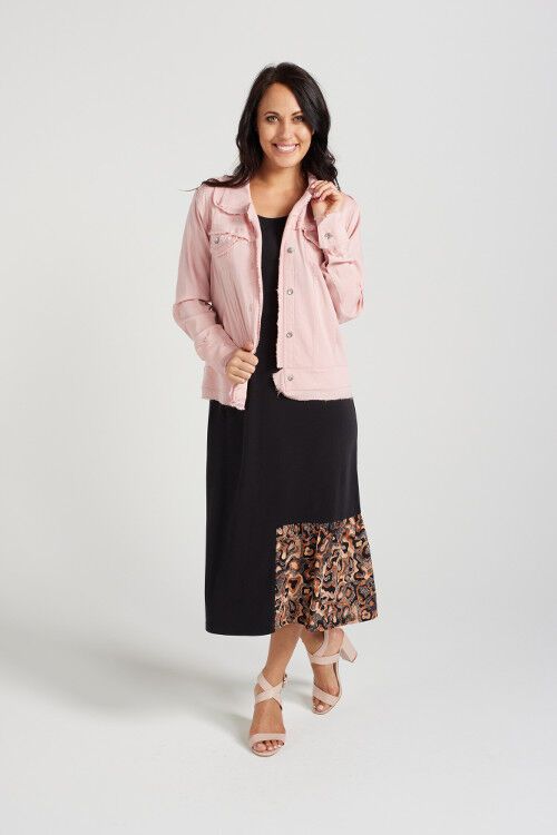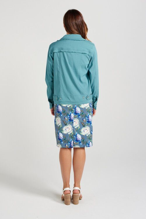 Jean style jacket with frayed finishing. Front pockets with hardware closure. Waist length. Perfect little summer cover-up for any outfit. 77% rayon, 21% nylon, 2% spandex