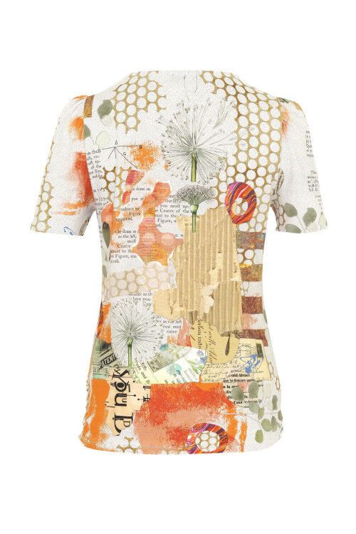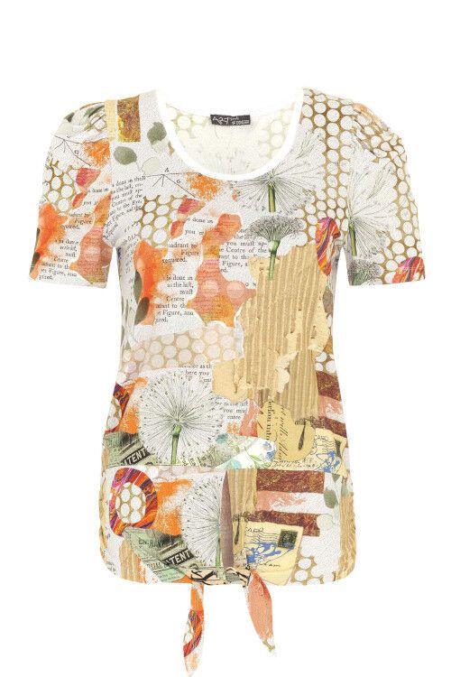 Simply Art by Dolcezza - "Big Changes" by artist Gina Startup, USA. An all over print in orange tonings. Short sleeved top with round neckline featuring white edging with small stud trim. The banded hem has a trendy front tie. 96% viscose, 4% elastane