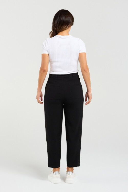 These relaxed-fit pants offer effortless style with a subtle twist, crafted from sleek black fabric for maximum versatility. The standout feature is a pleated detail at the bottom of each leg, secured with a button for added texture and a touch of utility-inspired charm. With a comfortable waistband and a loose, easy silhouette, these pants blend casual comfort with refined detail—perfect for everyday wear or elevated off-duty looks. 50.5% polyester, 45.1% viscose, 2.7% spandex, 1.7% cotton