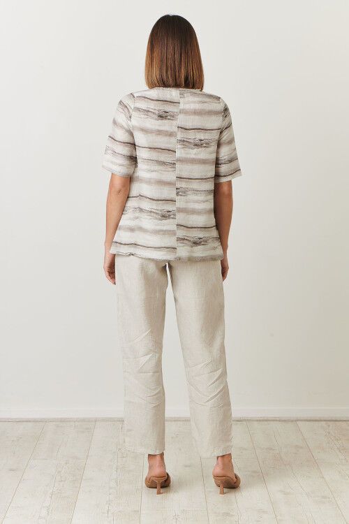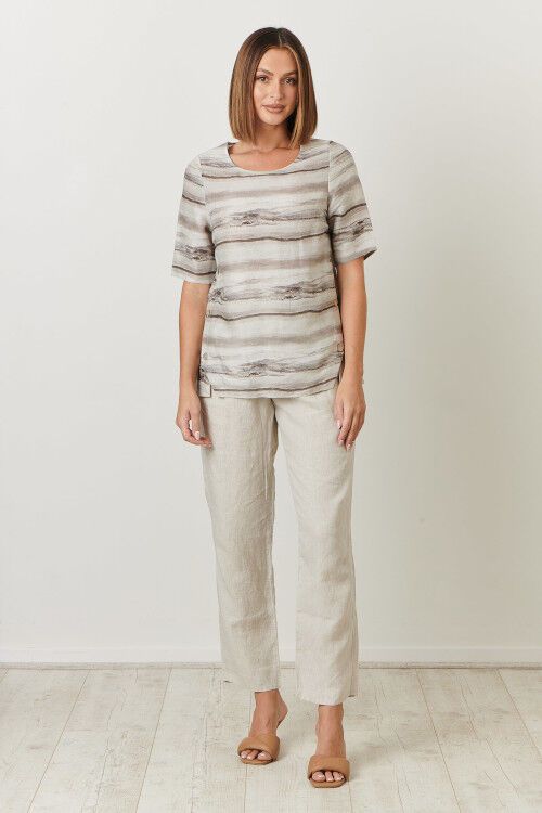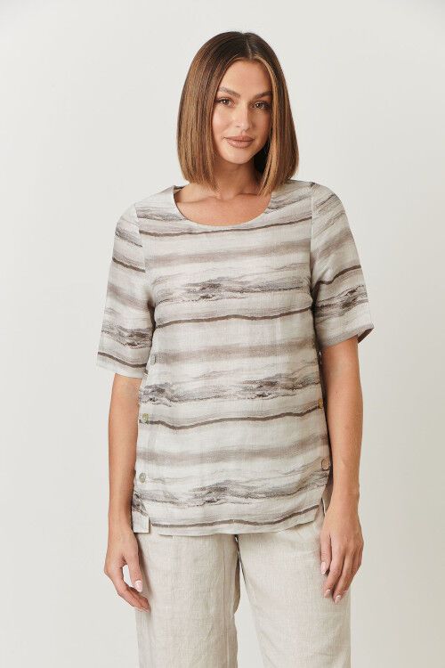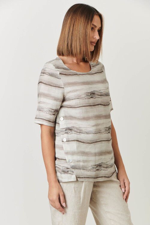 Round neck 1/2 sleeve top with feature side buttons. 100% linen