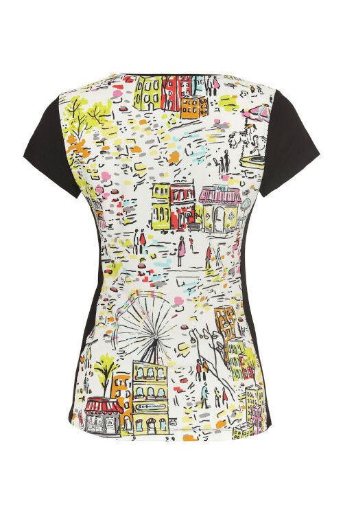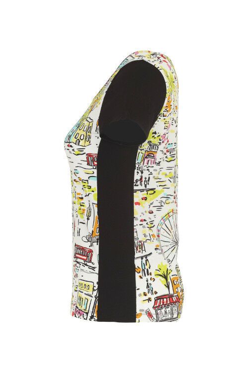 Bright cityscape print on the front and back, solid black side panels and short sleeves. Round neck and curved hemline. 96% viscose, 4% elastane