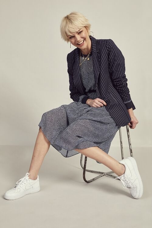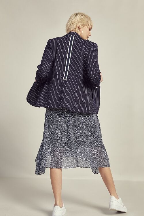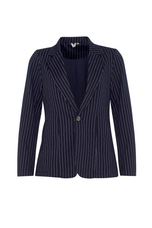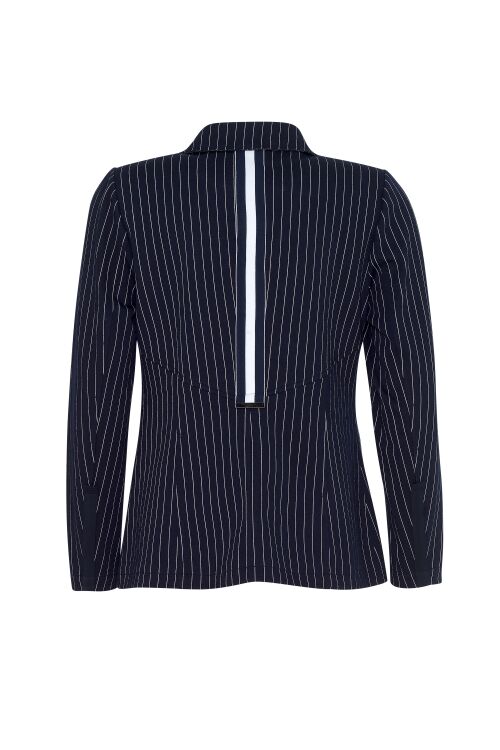 Single breasted pinstripe jersey blazer with striped tape on back seam, taped pockets and back sleeve. Garment is lined in jersey knit. A lovely stretchy comfortable blazer.  97% polyester, 3% spandex