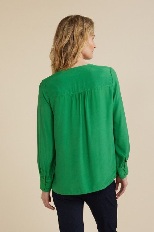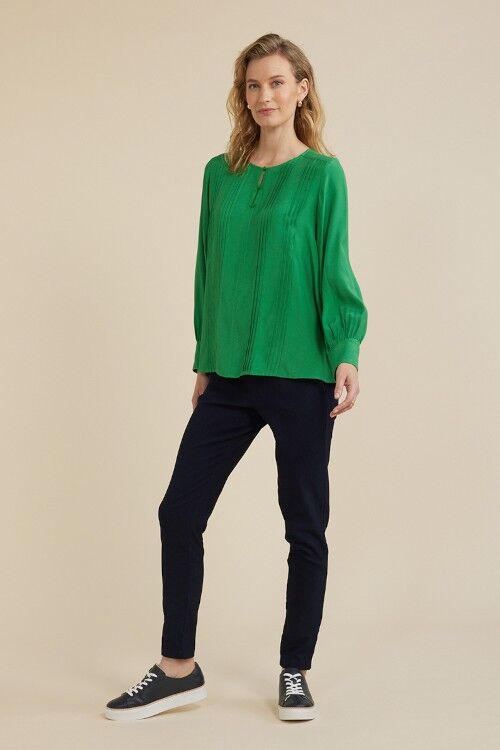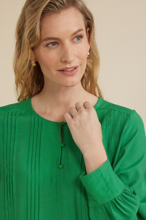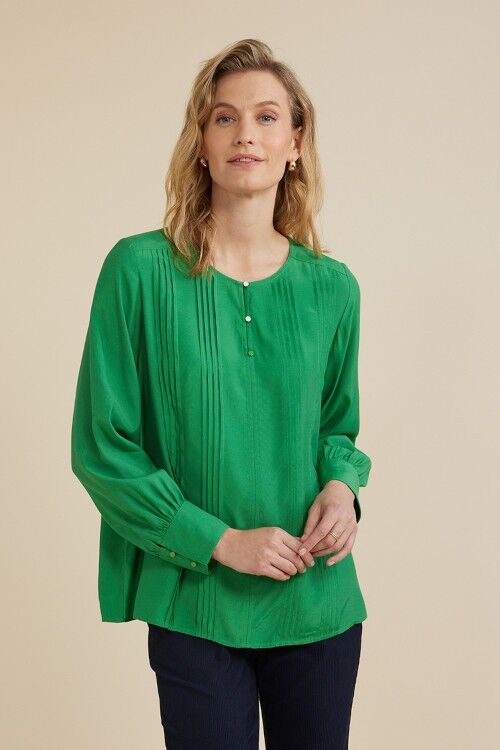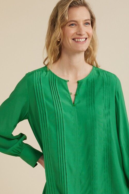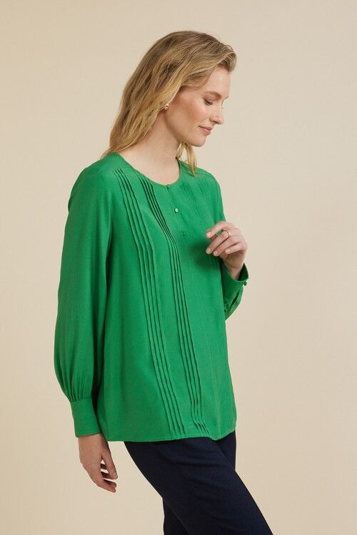 The tuck front top features front pintucking detail, front placket with 3 small buttons and full length cuffed sleeves. 100% viscose