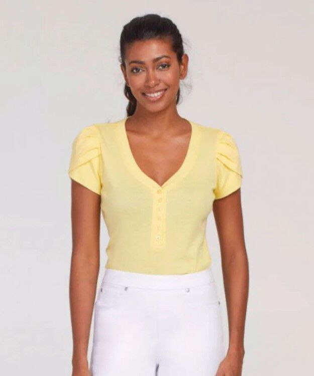 Cotton blend for maxmum comfort and wash durability, with a V neckline, button details and tulip sleeve. 60% cotton, 40% polyester