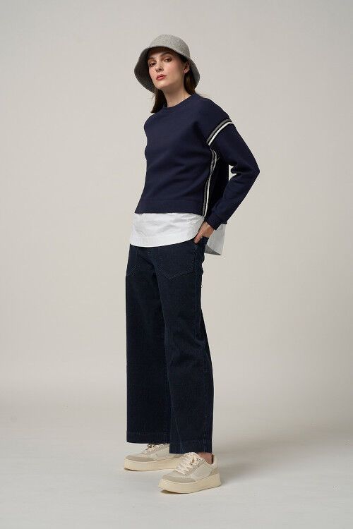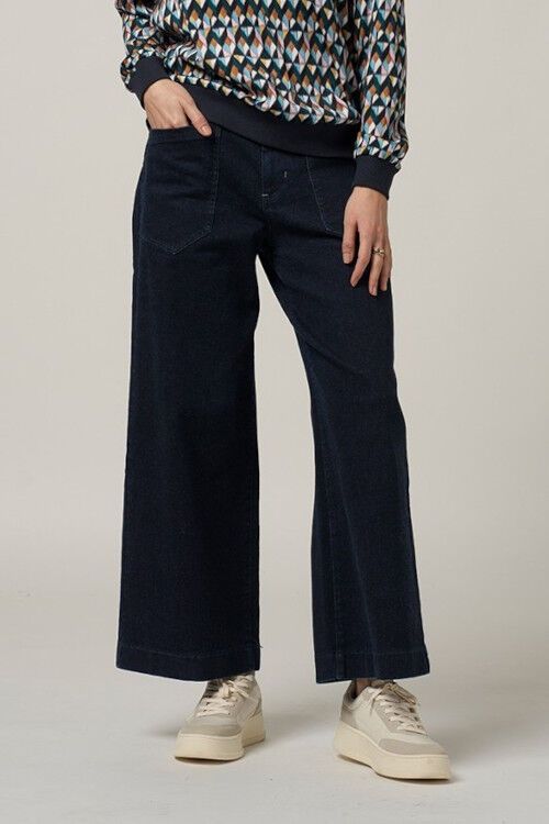 Stretch denim straight leg jean, with drawstring waist detail for the perfect fit. Features statement angled front pockets and back patch pockets. 98% cotton, 2% spandex