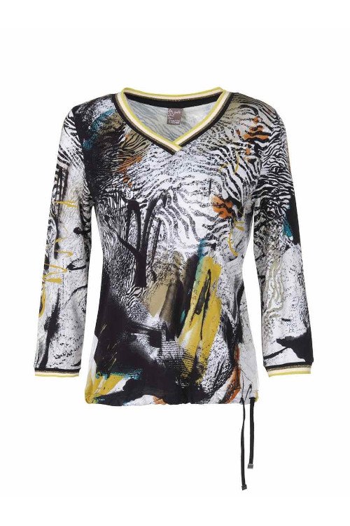 Simply Art by Dolcezza “Safari Escape” by Turkish artist Azize Ickan. V neckline with lime, cream and black stripe trim on neck and cuffs. 3/4 sleeves and drawstring hem. 94% viscose, 6% elastane