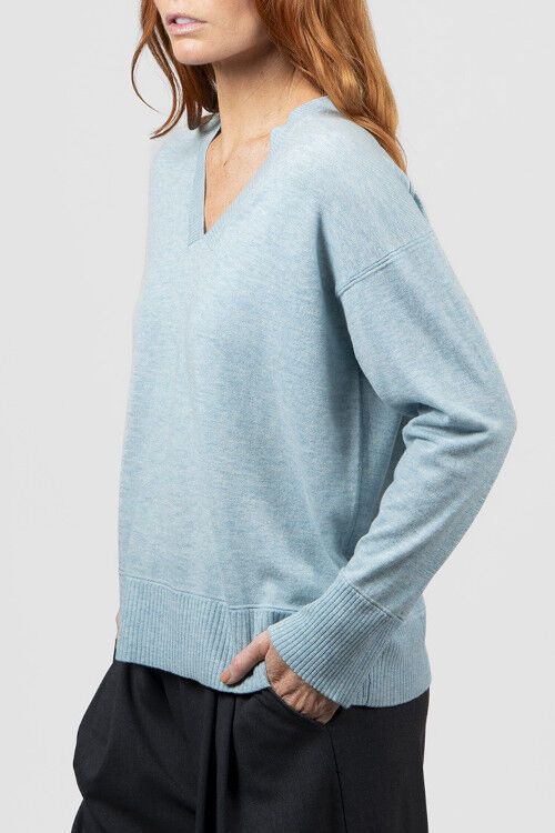 V neck jumper accented by elegant link trim and extended rib cuffs. The ribbed hem gives a clean finish and enhances the relaxed yet structured fit.  95% merino wool, 5% cashmere