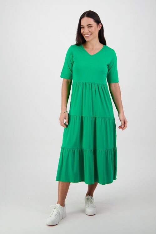 A great summer dress to pair simply with sneakers or sandals. V neck, decent length short sleeves and three tiers in the skirt. 50% cotton, 45% modal, 5% elastane