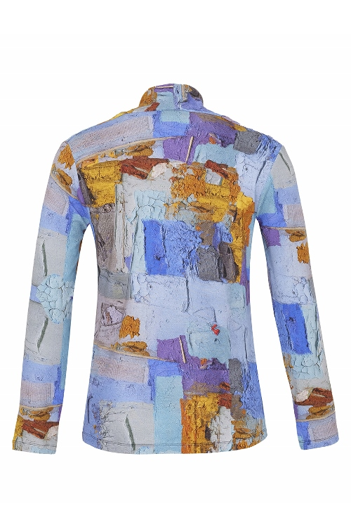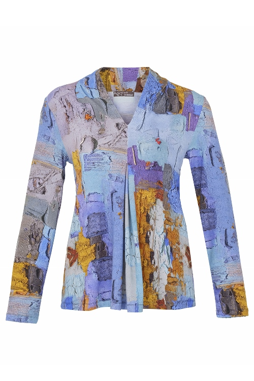 Simply Art by Dolcezza Top “Sovrapposizione di Civilta” – a stunning long knit top featuring a design of Carlo Bazzoni (from Italy) in blue, yellow-orange and grey tones. Featuring a V-neck, front pleating, long sleeves, and a stretchy fabric. 70% viscose, 20% polyester, 10% elastane