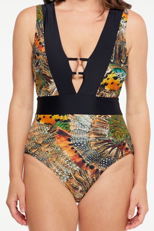 A stunning one piece swimsuit with plunging neckline and back tie at the neck. Featuring power mesh support and fully lined. 82% Nylon, 18% Spandex