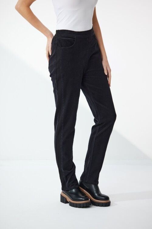 Designed with comfort and versatility in mind these cord pants feature a flat front and an elasticated back, making them easy to pull on and ensuring a perfect fit. The full-length design and straight leg silhouette create a sleek and modern look. With the added convenience of front and back pockets, you can keep your essentials close at hand. Cord fabric: 98% cotton, 2% elatane; Ponti trim: 60% viscose, 35% nylon, 5% elastane