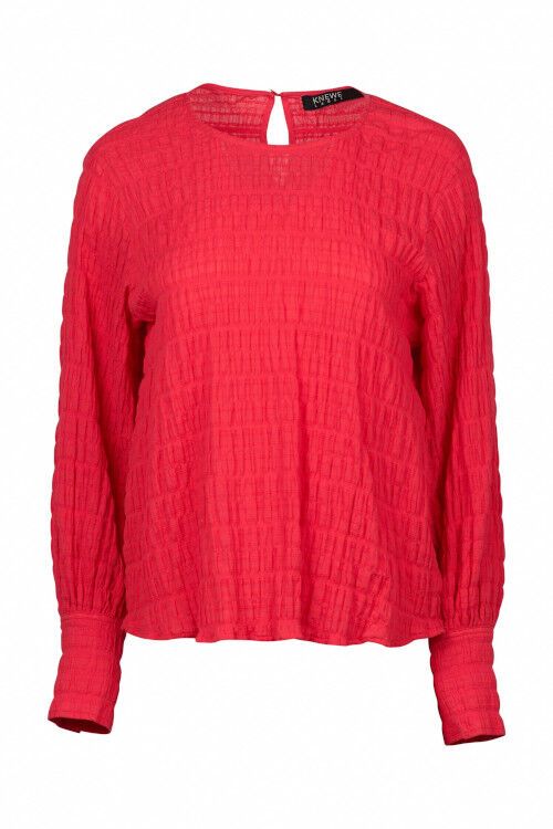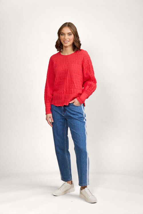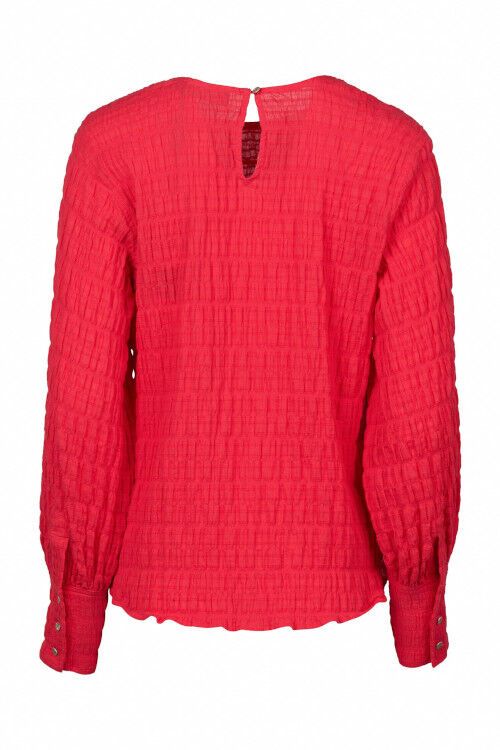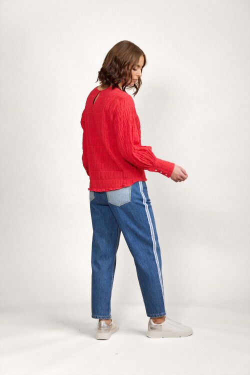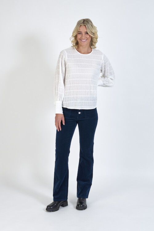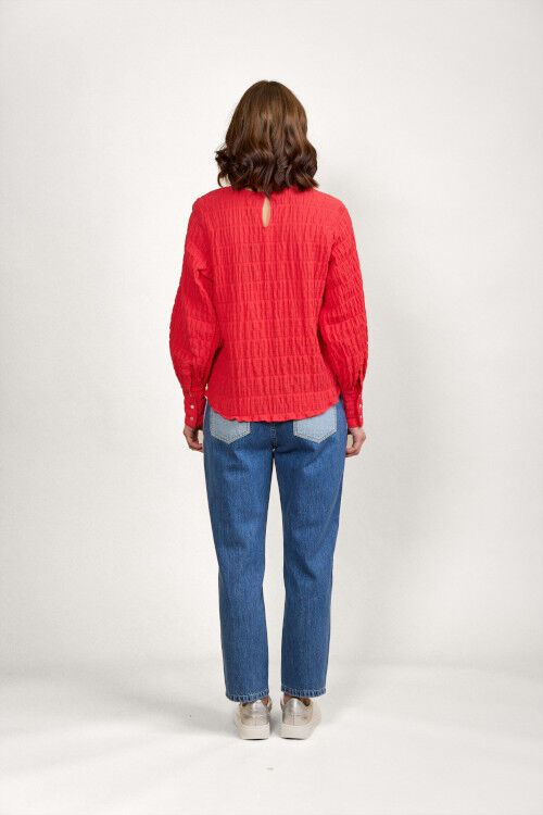 A relaxed fit top featuring round neckline with centre back keyhole with metal hammered button and elastic loop fastening. Long sleeves gather into cuffs which have a bound placket fastened with three metal hammered buttons. The hem is curved front and back. 99% cotton, 1% elastane