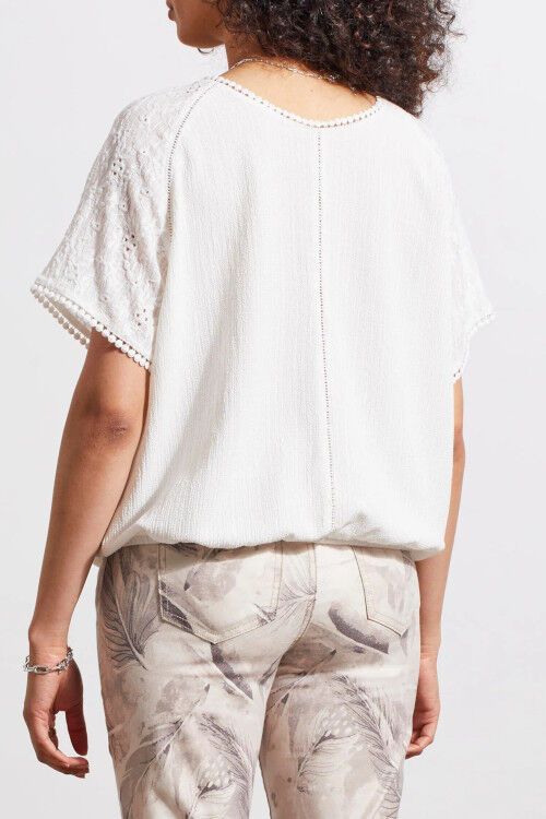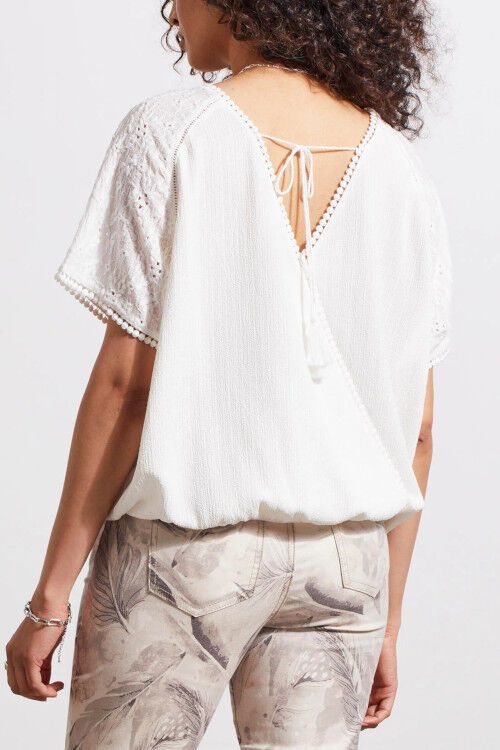 Designed with both crew neck and v-necklines, switch this 2-way top up how you like. We love the short raglan sleeves, textured knit fabric, and tassel neckline details. 97% polyester, 3% spandex