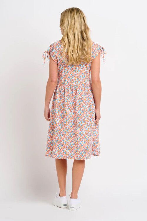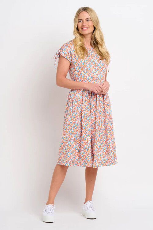 Look wonderfully whimsical in this knee-length, floral jersey dress with pockets. The gather-and-tie detail at the shoulders means that the sleeve length is adjustable. A lightweight jacket is all you need to complete the look. 100% cotton