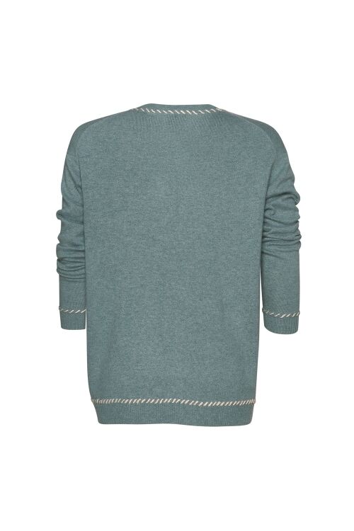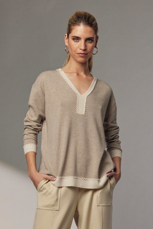 Relaxed-fit with contrast hand-embroidered whip-stitch defining the V-placket neckline, cuffs and hem band. (Note: taupe multi also features contrast coloured rib trim). 38% viscose, 35% recycled nylon, 22% extrafine merino wool (ethically sourced), 5% alpaca