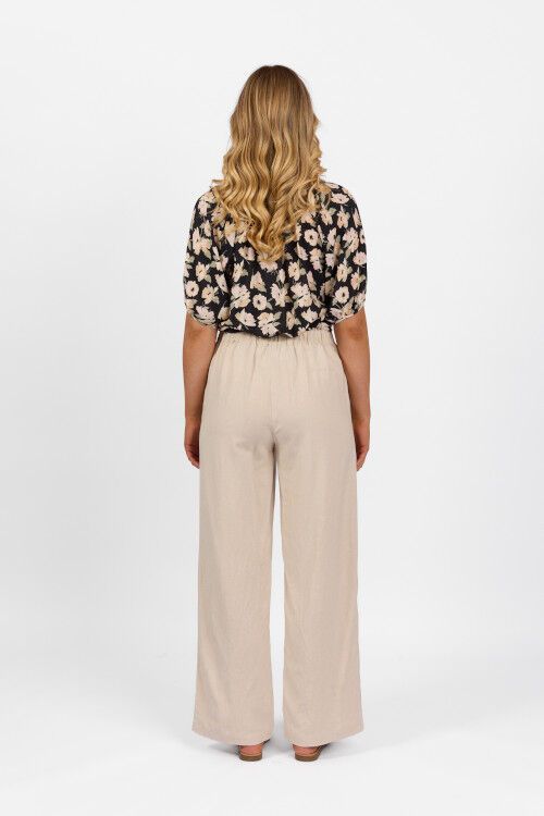 Wide leg full length pant with elastic back wistband. 55% linen, 45% viscose