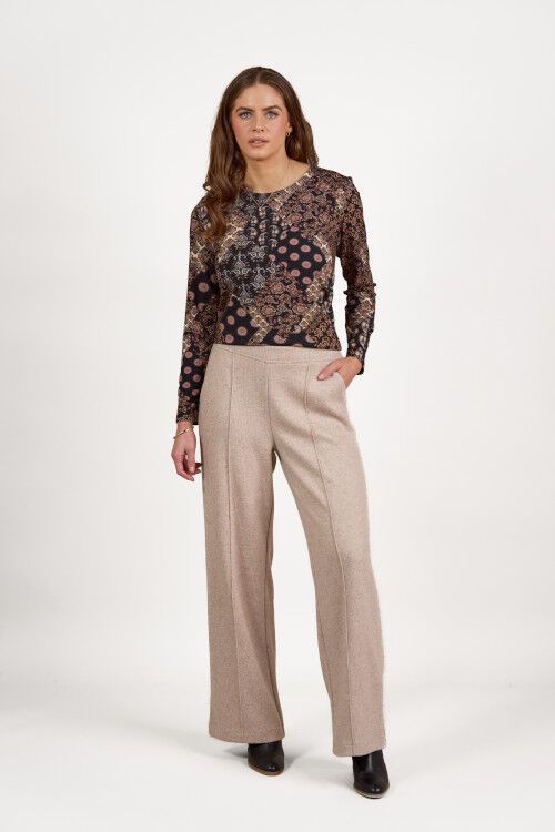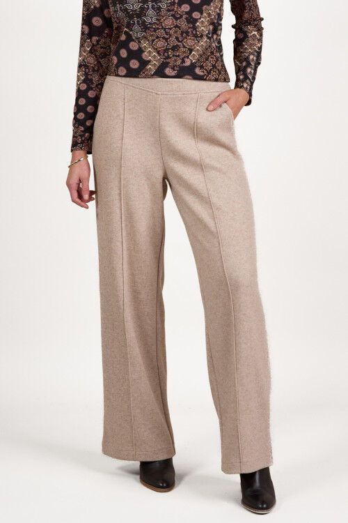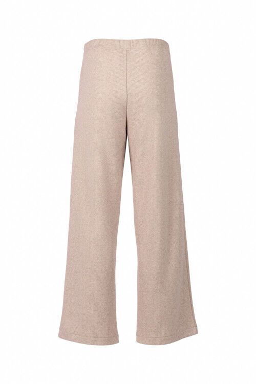 Wide leg full length pant with elastic back waistband with flat front. Soft knit fabric with a wool component. Front pintucks and front side angle pockets. 24% rayon, 21% cotton, 5% wool, 50% polyester