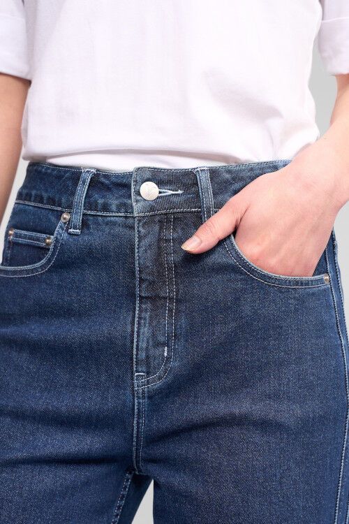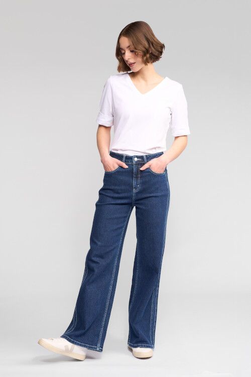 Wide-leg full-length jean in dark blue, designed with double seam detailing on the sides. This clean, elongating detail enhances the silhouette, creating a flattering, modern jean that works easily for everyday wear. 97% cotton, 3% elastane