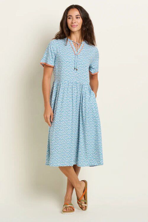 Keep it bold and breezy this summer with the Brakeburn Yasmin blue midi dress. With a loose fit around the waist, short sleeves, beaded tassels, and a pompom trim, this patterned summer dress is bringing the holiday vibes. 100% viscose