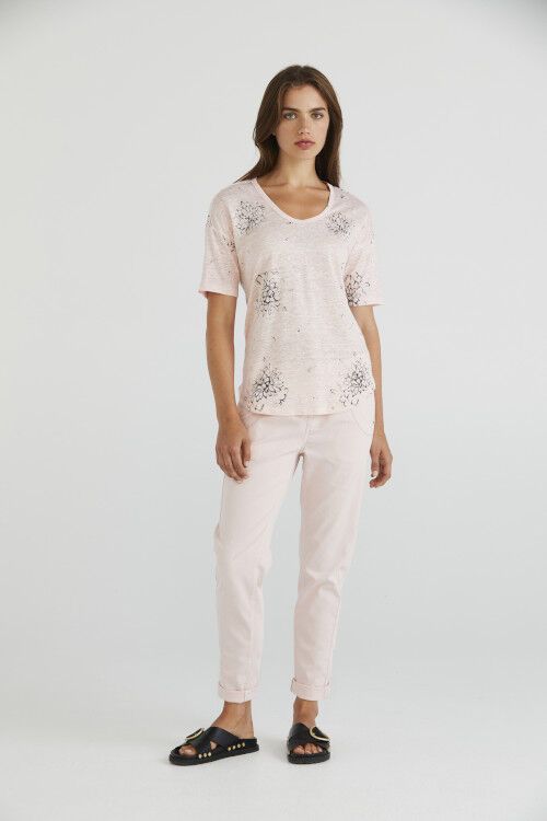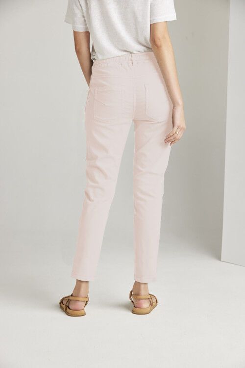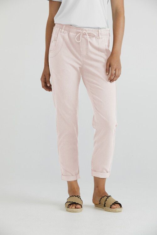 Casual jean with elasticated waist and adjustable drawstring tie. Novelty tape at outside leg. Soft handle and distressed finish are created by special garment wash. 58% cotton, 39% polyester, 3% elastane