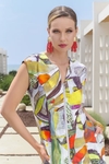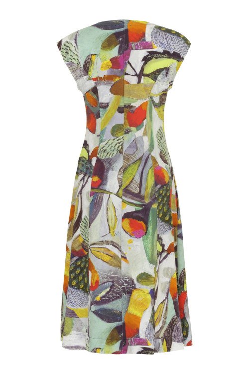 Simply Art by Dolcezza - "Botanica" by artist Este Macleod, UK. The bright print features colourful prints in an abstract garden design. A-line dress featuring a front zip, notch neckline and side pockets. 95% cotton, 5% elastane